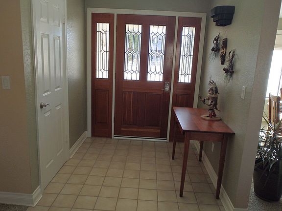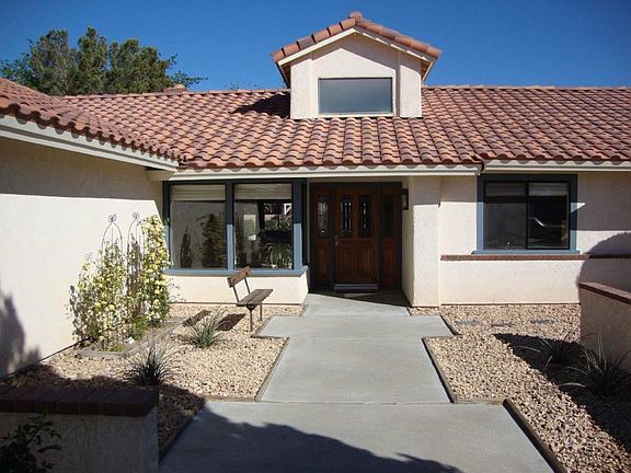 New front yard features xeriscape,pavers & grass.Front dr has side lites.Tiled entry opens to carpeted living rm w/view of yard.Fireplace has gas lighter& pot shelf. Bay window gives view of pool & patio.Off to right is office/retreat with dr to patio.Formal dining has view of front.Tile continues to dinette;open to remodeled kitchen.Granite counters,sink, & window sills;tile backsplash & tons of storage!Laundry rm has wall of pantry & 1/2 bath.Finished garage has wall of storage.50 gal water heater w/circulating pump.Back to entry:hall leads to 2 lge carpeted guest bedrms.Wall of hall cabinets.Guest bath has tub w/personal shower. Kingsize master suite features octagonal stained glass window, slider to patio,fan,more storage plus walk in closet!Bath has long tub plus stall shower;new toilet.Glass block for lite.Back yd has block walls:south sides has garden area w/shed.moving to the left is grass area;tons of new foilage including pine trees,palms,oleanders,desert willows, another grass area!2 covered patios for sitting/dining w/planters in between.North side has grape arbor & rm for bbq.Olive tree! Grdmted cooler in shade.RV gate.10x50 fiberglass heated pool w/rolling cover.