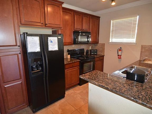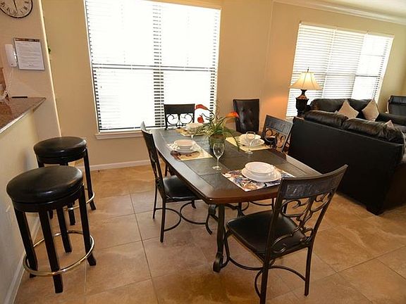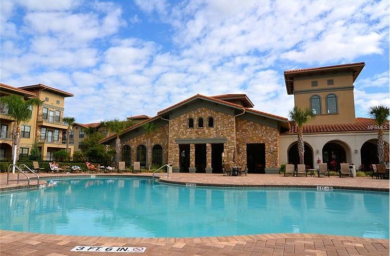 Beautifully furnished Italian Mediterranean style corner/end-unit condo, very upgraded with 16" tile in common areas, carpet in bedrooms, granite countertops in bathrooms and kitchen, cherry kitchen cabinets and crown molding in ceiling. All 3 bedrooms have their own full bathroom. Enjoy the 2nd floor view from a large wrap around covered balcony. New front load washer and dryer. Bella Piazza is zoned for short term rental which makes this a great investment property, it has 2 community pools, kiddie pool, a fitness center, business center, BBQ area and an on site manager. Shopping and restaurants right up the street. Close to Disney and airport.