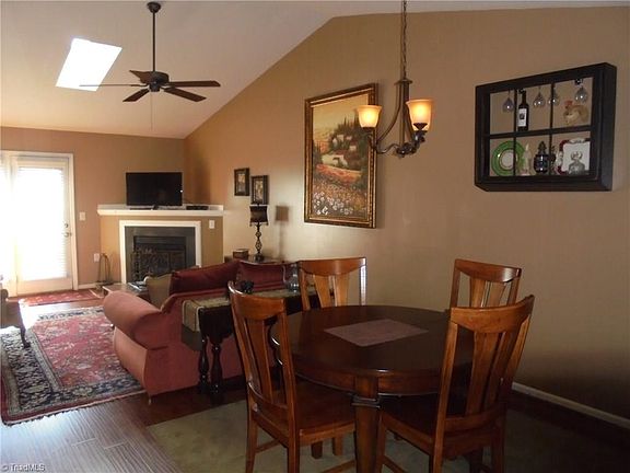 Classy one level condo with 2 bedrooms and 2 full baths....lots of nice features such as vaulted ceilings, a skylight, eat-in kitchen with pantry, large family room with a fireplace that adjoins another dining area....upgraded flooring, an actual laundry room (not just a closet) and last, but not least, an inviting, private enclosed patio area with a utility room for additional storage. NICE!