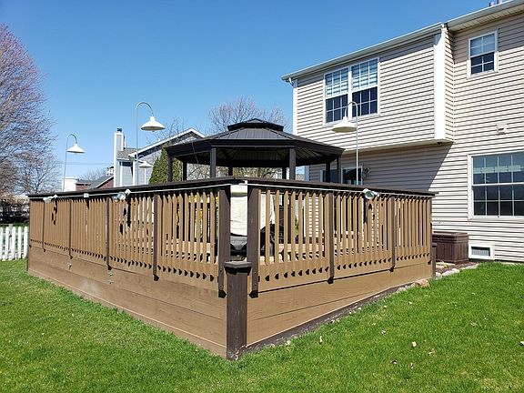 Spacious duplex backing to huge wetlands!. Well built, extremely well maintained and upgraded, no disappointments here! Large two tier deck walks out to wetlands and amazing sunsets. Interior has an open floor plan, fireplace in the living room, separate dining room and eating area off of the wood cabinet kitchen with huge island/sitting area and a whole extra wall of cabinetry. Updated 1/2 bath w/stone back-splash, dark wood vanity and custom canned lighting. Rich, engineered flooring through the home, Vaulted ceilings in master bedroom with separate sitting area. Updated ceramic tiled hall bath, soaker tub, w/custom cabinetry, built-ins and recessed lighting everywhere! Elegantly decorated throughout this large home. Updated furnace & central air (2018) & water heater. Receipts/manuals for most everything updated. Let's talk entertainment... hardwired throughout the home including the large, two tier deck w/aluminum gazebo shelter, grill area and stairs to rear yard and wetlands. Custom lighting throughout exterior and deck areas, 2 car, heated, attached garage, updated roof and no neighbors to the side or rear! 2 large sheds in rear stay.