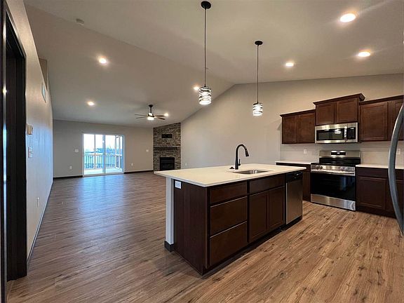 New walkout ranch zero lot. Kitchen features hard surface counter tops, large walk-in pantry, and island. LVP flooring throughout the kitchen, dining, and living room. Corner gas fireplace in the living room. Covered deck off the living room. Primary bedroom has a walk-in closet and private bathroom. Bedroom 2 on main level has a walk-in closet. Laundry room with drop zone. Finished walkout lower level with rec. room that leads to the patio, 2 bedrooms, bathroom and storage. Left Side. Photos of the actual property.