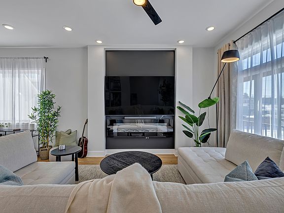 * Second level features an open-plan kitchen/dining/living area with large glass doors, an in-wall electric fireplace, and a half bathroom. The kitchen boasts an island with a trash drawer, pantry, slide-in gas range, range hood, and open shelves.
