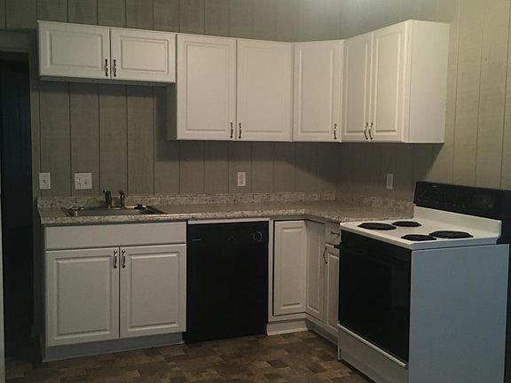 This newly renovated three bedroom features a large kitchen and dishwasher, a large living room space, and a lit parking area behind the house.