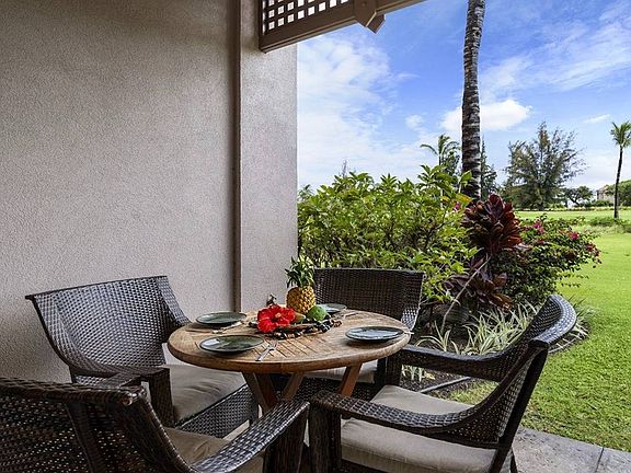 Luxury Condo along South Kohala Gold Coast with cathedral ceilings (18ft), plenty of space, Fairway frontage, Lanai's upstairs and Down.Waikoloa Colony Villas presents upscale Townhouse design and living: No neighbors above or below, this Condo is 2 story & offers huge Master Bedroom en-suite (w/Western King & large Master Bath for 2) plus separate guest bedroom; 2.5 Bath floor plan is upgrade, w/full garage and storage space. Outdoor Lanai's upstairs & down (verandas), for morning coffee, afternoon cold ones & views across golf course to mountains and ocean.