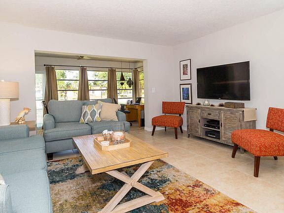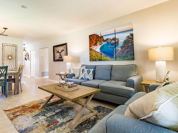 Fantastic light & bright cream puff, the one you've been looking for!! This updated & enhanced E-Model is move in ready. Extra wall of cabinetry in kitchen with open doorway to dining area. Windowed porch now open to living area and enjoys a park-like feeling, bringing the outdoors in, even a view of the nearby lake. Newer cabinets, granite, appl's, A/C, neutral porcelain tile throughout, knock-down ceilings, modern bath vanities & lighting, electric panel updated along w/outlets, fixtures & fans. Designer appeal with freshly painted toned walls & white trim. Model perfect & truly unique feeling in this coveted corner court location. A perfect full-time, vacation or seasonal get-away, a well-maintained & managed community and convenient location to shopping, golf & more.