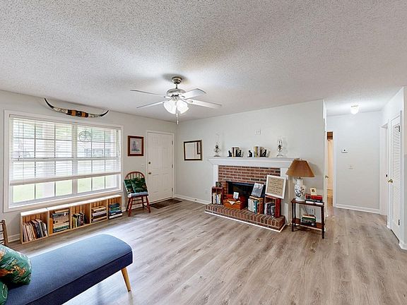 Affordable, move-in-ready, 3 Bedroom/2 Bath home with a metal roof, bonus room, NO carpet and a brand new water heater! This attractive home welcomes you with a walkway from the driveway to the covered front porch, featuring 4 white columns and brick skirting. Enter to the living area, updated with vinyl plank flooring that continues throughout the house. The fireplace is the focal point of this spacious room, with a brick hearth framed in a white mantle. The dining area is stationed between the living area and kitchen, with access to a pantry closet in the corner and to the covered back deck. The backyard is level and partially shaded. The kitchen has plenty of counter space and cabinetry on both sides, and provides a window over the sink, overlooking the back yard. The laundry room separates the kitchen from a long bonus space. The primary bedroom is situated on the right side of the home in this split bedroom plan. The space includes 2 closets and an ensuite bath. The two spare bedrooms are on the opposite side of the home, sharing the 2nd full bathroom.