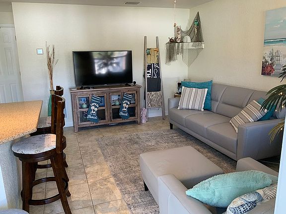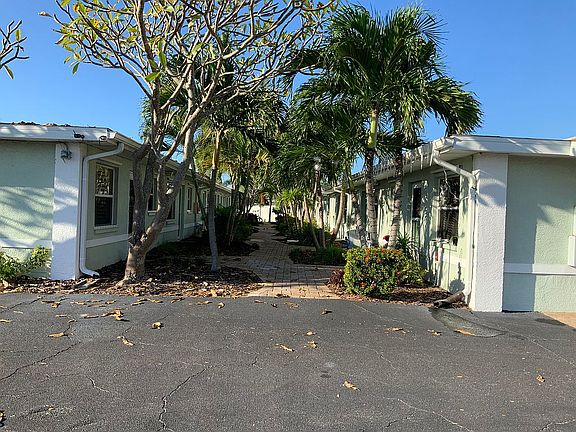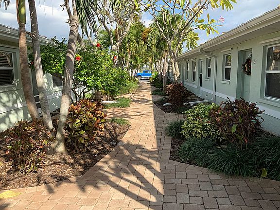 We love the location, tropical feel & friendliness. Grab your piece of paradise in this tropical heaven only a 10 minute walk to the beach. Inviting, quiet end unit next to the on-site laundry room. Inviting pool area (right around the corner) with plenty of palm trees & a tropical feel. This unfurnished 2 bedroom (master 16-1/2 feet by 11-1/4 feet) & guest room (13-1/2 feet by 11-1/4 feet) 1 bath pet friendly unit is perfect for daily living or that relaxing get away. HOA includes water/sewer, internet/cable, garbage, pool & landscaping maintenance. The kitchen/dining/living room is open concept & includes appliances. Appliances, AC and HVAC are approximately 4 years old. There is also a Suncoast storage unit in back of the condo for storing beach chairs etc.