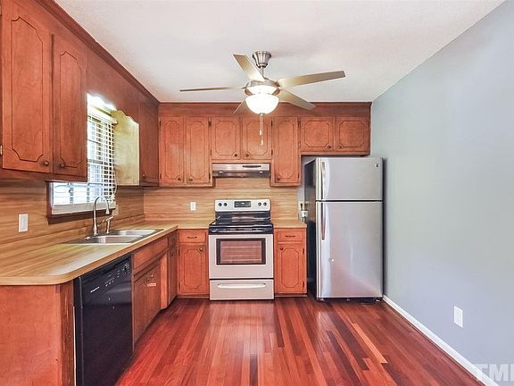 This Raleigh one-story home offers a deck, hardwood flooring, and electric heat.