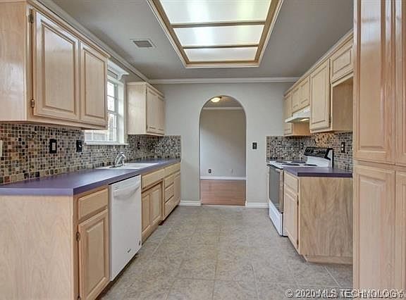 MOVE-IN READY! Pristine w/NEWER: Dishwasher, Hot Water Heater, Paint, Flooring, Backsplash, Lighting & Plumbing Fixtures, Window Coverings, Exterior Window Screens, & Chimney! 3 Bed, 2 Bath, + Office or Formal Dining. Large Living w/Corner Fireplace & Arched Windows. Master Bedroom Features Full Bath (Dual Sinks, 2 Walk-in Closets, Separate Shower, Whirlpool Tub). Covered Front & Back Porch (Back w/Lighted Ceiling Fan). Full Privacy Fence & Guttering. Security System. Great Location, Neighborhood Park!