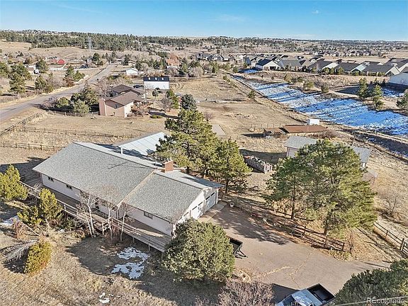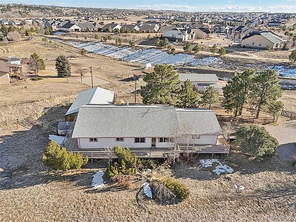 Discover the potential of this spacious ranch-style home on a generous 2 acre lot, minutes from Southlands, golf, dining and shopping, walking paths, dog park and only 25 minutes to Denver International Airport, offering the perfect blend of country living and city convenience. This 3 bedrooms and 3 bath home features a walk-out basement which has 2 additional non-conforming bedrooms, office and a bathroom, wet bar and game room with an attached pool house ready for your updates or remodeling to fit your lifestyle. This residence is well-suited for a variety of living arrangements, guests, extended family or income potential. Highlights include open kitchen with island, eat-in space, two fireplaces, a three-car attached garage provides ample space for vehicles, while an additional barn/outbuilding with 2 garage doors, extra storage offering versatility for a workshop, home business or hobby space and home has a newer roof. Enjoy the freedom of well water and no HOA fees and lower property taxes comparatively in unincorporated Parker. Property being sold as-is, ready for your personal updates. Seize this chance to own a property rich with potential and endless possibilities. A fantastic chance to create your dream home! Contact the listing agent for more information or to schedule a showing. Don't miss out on this rare opportunity!