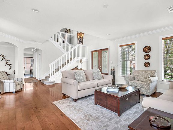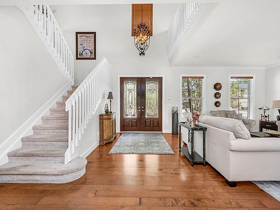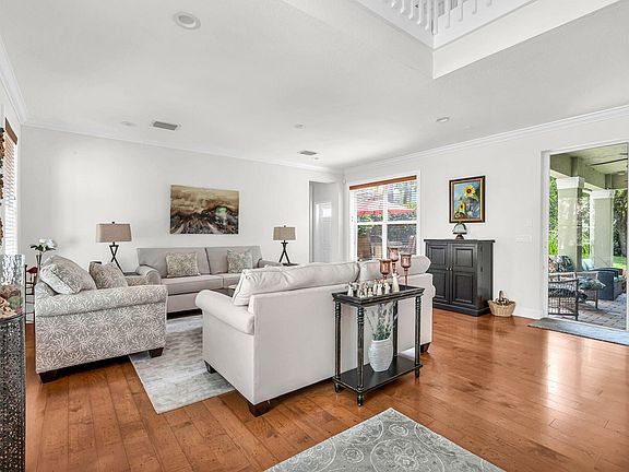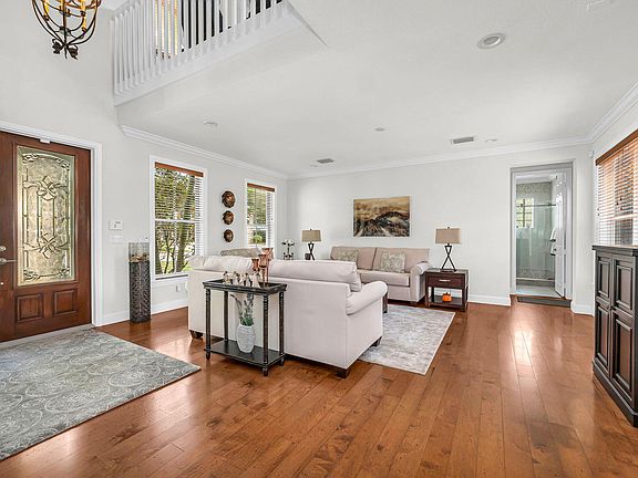 Welcome to luxury living in the gated community of Savannah Estates. Enter through the new designer double doors into a spacious foyer with a 20-ft ceiling and crown molding throughout. The formal living room is bright and sunny with great wall space for furniture placement. Formal dining room just off the kitchen with space for china cabinet. Beautiful floors throughout the first floor. The gourmet kitchen has newer stainless steel appliances and granite countertops. There is ample counterspace for meal preparation and abundant cabinets for storage. The kitchen opens to the large family room ideal for entertaining. Behind the kitchen is flex space. This works well for a home office, workout room or bedroom number five. A first floor guest room adjacent to an updated full bath can be an in-law suite with one level living. Enjoy your morning beverage on the balcony just off the primary bedroom which overlooks the large backyard into green space. French doors lead off the Primary Bedroom into a large private sitting room (which can be converted into a 6th bedroom). The primary bath is elegant and large with double sink vanity and a tremendous shower with glass doors. There is no shortage of storage in the large closets. There are two additional bedrooms on the second floor and another full bath with tile flooring and shower. A large loft area can be a home theater, game room or music area. There is plenty of space for everyone. You will love outdoor entertaining on the large paver patio with built in grill, casual sitting area and lighted eating space. Other endearing features include: 2-zone air conditioners that were replaced in 2018 and 2020. New roof and gutters installed in 2020. 2 car garage features overhead storage, refrigerator and new epoxy floor. This home has a full-house security system, hurricane shutters, central vac and is wired for speakers throughout, all offered in this move-in ready home. A+ rated school district.