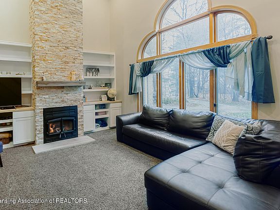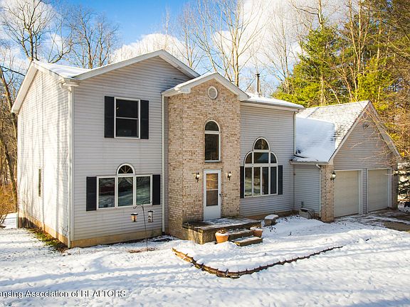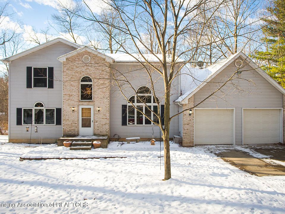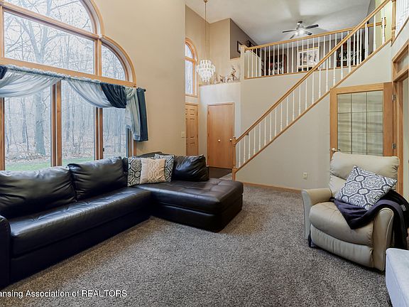 Welcome to 9043 Lansing Rd! This 4-bedroom, 2.5 bath home is located in Haslett but with low Woodhull Township taxes and sits on over 2 acres overlooking the Looking Glass river. The main floor features a great room with a stone wood fireplace surround that spans 17 feet from floor to ceiling with built in storage on both sides, a first-floor primary suite with walk in closet, first floor laundry and a second bedroom that is currently being used as an office. Two additional rooms can be foundon the second floor with a large loft area. The finished walkout basement offers a spacious area for entertainment and has plumbing rough in for a full bathroom. Other features of this home include a portable generator hook-up, 2.5 car attached garage and two sheds. Schedule your private tour today!