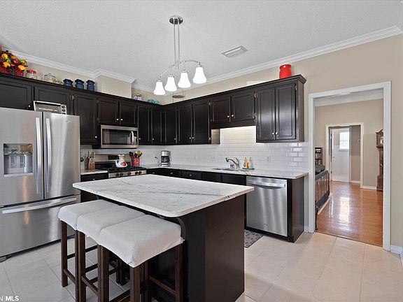 This beautiful home will put you in one of the most convenient locations in West Mobile. Located in a very desirable, private neighborhood with one entrance. The best schools, great dining and shopping are located within minutes. Kitchen features quartz counters, dark cabinets, stainless appliances, and a nice eat in area. The living room has a great fireplace feature and overlooks the awesome screened in porch. The formal dining room is open to the living room and ready to be whatever bonus space you want. Primary bedroom is extra large with a private exit to the porch and a walk-in closet with 2 separate doors. The en suite primary bathroom has quartz counters, stand up shower and separate tub. The second and third bedrooms are split from the rest of the home and have easy access to the second updated bathroom. The fourth bedroom is upstairs and has a full bathroom making it ideal for a private space. Hardwood floors in the living areas, carpet in the bedrooms and ceramic tile in the wet areas. Relax on the custom covered patio and enjoy the large backyard. New AC in 2022, new TANKLESS water heater 2023, and the roof was replaced in 2015. Backyard is flat and has a nice sized storage shed. This is a great move-in ready home in this West Mobile Neighborhood. Located in the 100% USDA financing eligible area. At this price, you better move quickly. Don't just find a house, find the home for your lifestyle.