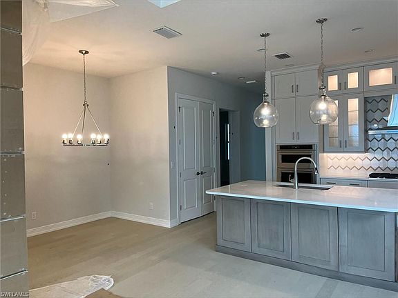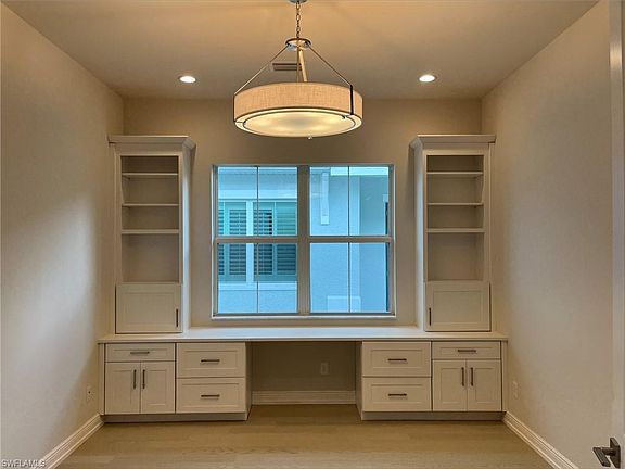 Home is nearly completed and will be available to close by the end of October 2023. This beautiful Baypointe is an opportunity you don't want to miss! The welcoming covered entry and foyer flow into the spacious dining room and great room and out to the desirable extended screened lanai with gorgeous view of the lake's fountain. The kitchen is equipped with a large upgraded center island with breakfast bar, ample counter and cabinet space, and a roomy pantry. The serene primary bedroom suite is complete with a sizable walk-in closet featuring custom built-ins and a spa-like primary bath with dual-sink vanity, luxe glass-enclosed shower, and private water closet. The secondary bedroom features a roomy closet and shared access to a full hall bath. Additional highlights include a versatile office with built-in desk and shelves off the foyer, centrally located laundry, and additional linen storage. This home comes with ample upgrades including impact glass windows and doors, gorgeous engineered hardwood floors through most areas of the home and upgraded tile in the bathrooms and laundry room, and upgraded appliances. Call to make an appointment to see this spectacular home today!