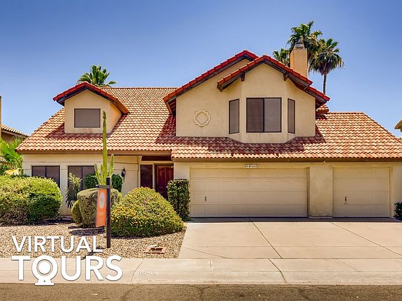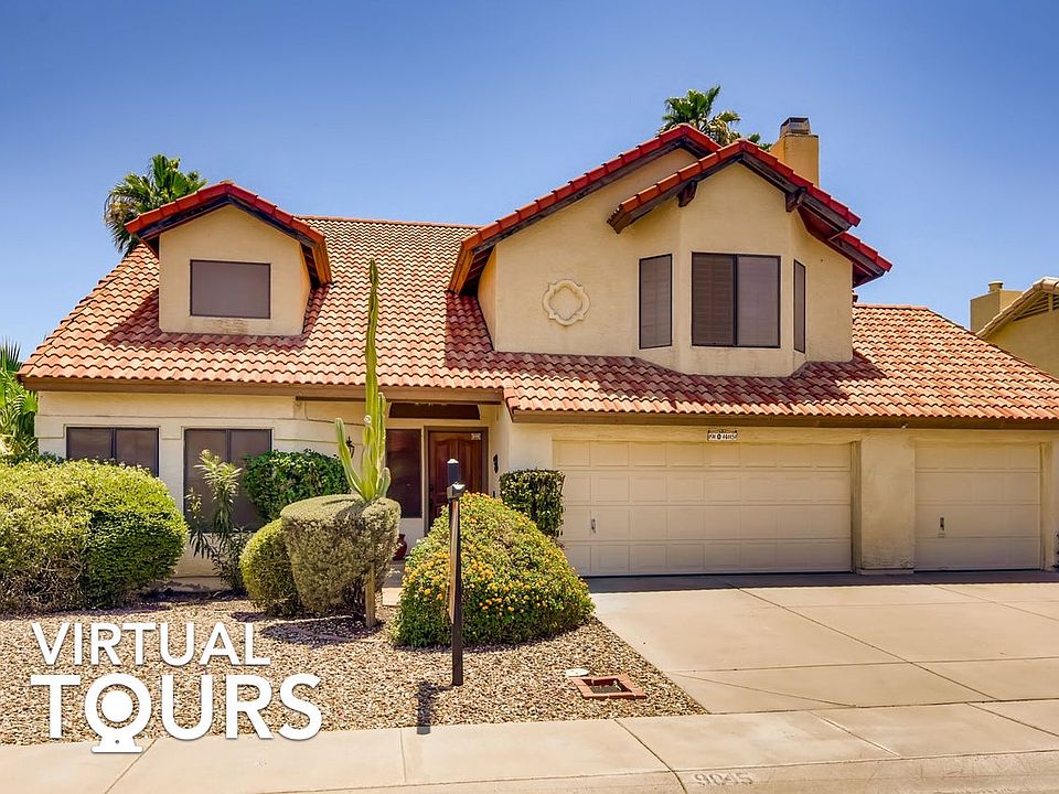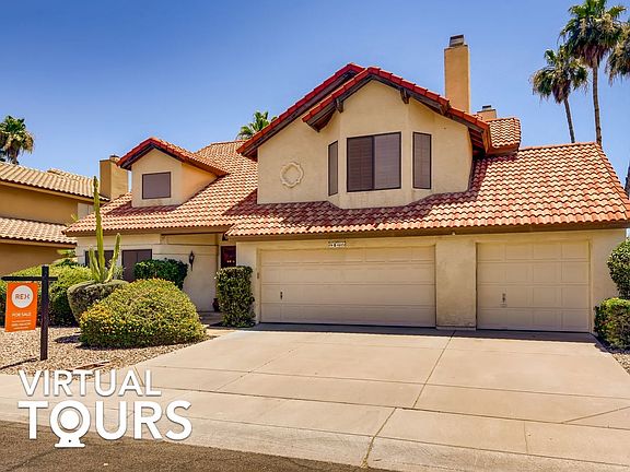 Beautiful 4 bd/ 3 ba two-story home with updated kitchen and resort-style pool in excellent Scottsdale neighborhood. Past the desert landscaped front yard and low maintenance xeriscape, you are ushered into a gorgeous foyer with a distinct, Southwestern feel. A formal, sky-lit sitting area with vaulted ceilings and an arched wall pass-through is positioned to your left, which leads into the carpeted dining area. Another living space lies straight ahead from the entrance, which offers outdoor access via sliding doors, and flows onward into the kitchen. Massive, newly remodeled and equipped with helpful track lighting, hickory cabinets, pristine granite countertops and stainless steel appliances, this kitchen is absolutely perfect. All four bedrooms can be found on the second level, with the primary boasting a fireplace, Southern-style shutters, a large walk-in closet, vaulted ceilings and a large ensuite bathroom, complete with a tiled soaking tub, granite vanity and dual sinks. The three remaining bedrooms are all carpeted with large closets, and share a bridge-walk open to the downstairs living area. In the backyard, you can enjoy the incredible pool and spa -- it truly feels like you're at a resort in the comfort of your own home! With palm trees lining the perimeter, a beautiful covered deck for relaxing and getting out of the desert sun, and an area for grilling, this outdoor living space is the ultimate for any entertainer. Other features: Central A/C, forced air heating, three-car garage and driveway, heated pool and spa. Nearby: Thunderbird Park, Northsight Crossings, OdySea Aquarium, Gainey Ranch Golf Club, Phoenix Mountains Preserve, local shopping and dining, easy access to 101 Fwy and minutes from downtown Phoenix.