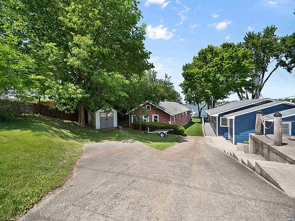Could this be the lake house of your dreams? Boasting 56’ of lake frontage, open concept layout with vaulted ceiling & waterfront wood deck—this charming cottage is being sold turnkey & is sure to please! Located on Buttermilk Point, the southern edge of Lake Wawasee, this 2 bedroom, 1.5 bath fixer upper makes an excellent investment property or weekend getaway, you can move right in as is or tear down & bring your ideal vision to life! Built in 1955 it retains a retro style with tons of character & a classic exterior with red siding & white trim that pops. Inside you’ll find a warm & welcoming atmosphere complemented by earth tones & exposed beams in the ceiling. Step into the efficient eat-in kitchen with abundant cabinetry, ceiling fan & groovy hanging lamp. Kitchen is on tile flooring & links to long stretch of carpeted flex/living space—plenty of room for a formal dining zone underneath the wagon wheel chandelier, games/rec area & then a cozy seating zone in front of the wood burning stove with brick accent wall. Even more seating room at the end of the home by the wall of waterfront windows & sliding glass doors to walk out deck, perfect for relaxing any time of the year in comfort as you watch the sunrise & sunset! Sizable primary bedroom has en suite half bath with linen closet; good sized 2nd bedroom & possible 3rd bedroom which is currently being used as utility/storage room. Main shared full bath has updated vanity & walk-in shower. Back deck has semi-private feel due to neighboring vegetation & tall shrubs & trees offering both shade & privacy as you kick back & bask in the beautiful scenery; or hang out on the Flo pier & catch some rays! Flo pier & lift are included! Lot is 0.22 acres with a big back yard for all kinds of fun & activities or more space for your new build. Free standing shed by roadside parking for all your tools & toys. Lake Wawasee is an all sports lake & the largest natural lake in Indiana, located in the resort town of Syracuse. A highly popular area especially during the lake season, it features 3 on lake restaurants & marinas with many activities & year round nature viewing opportunities. Home looks out onto Borst Bay & is mere minutes from the public access point. Are you ready to have your best summer yet, boating, swimming & living life to the fullest? Don’t let this one slip away—reach out today! (Note: All furniture is included except for bumper pool table.) Pier #351