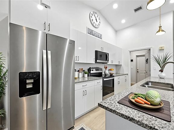 THIS IS A SHORT SALE! Welcome to your new family home! Located in the rapidly growing community of Port LaBelle, this charming 3 bedroom, 2 bathroom, 2 car garage home featuring 1408 sqft offers a fully fenced in yard and split floor plan that maximizes comfort and functionality. This home features ample amounts of living space with its open floor concept and has impact windows and doors. Low homeowner's insurance! The spacious kitchen with a breakfast bar seamlessly connects to the dining and living areas, perfect for entertaining. Its sleek cabinetry, large island with granite counter tops and stainless steel appliances is a chef’s dream. The large laundry room is just off the kitchen and garage and the washer and dryer are included. This room also doubles as a large pantry giving you plenty of space for storage. This home has luxury vinyl flooring throughout, high ceilings with recessed lighting, blinds on all windows and a ring camera system. The primary suite offers privacy, spacious walk-in closet with an en-suite bathroom with a dual sink vanity and an oversized walk-in shower with a rain head shower. As you come up the large driveway, you will find a modern home in a country charm neighborhood with the luxury of city water. The 2 car garage has sturdy built-in shelving on two walls and hanging storage from the ceiling for bins and bicycles. Let the kids and dogs play in the oversized, FULLY FENCED IN 0.34 acre lot with a peach tree in the backyard! Not in a flood zone (X), No HOA, No CDD! This quiet location is conveniently located to great schools, I-75, SR 80, SR 82, RSW International Airport, Red Sox and Twins training facilities, Florida Gulf Coast University, shopping, dining, entertainment and the amazing SW Florida beaches. STOP PAYING RENT and start investing in your family’s future! Call to schedule your showing today! Photos were virtually staged.