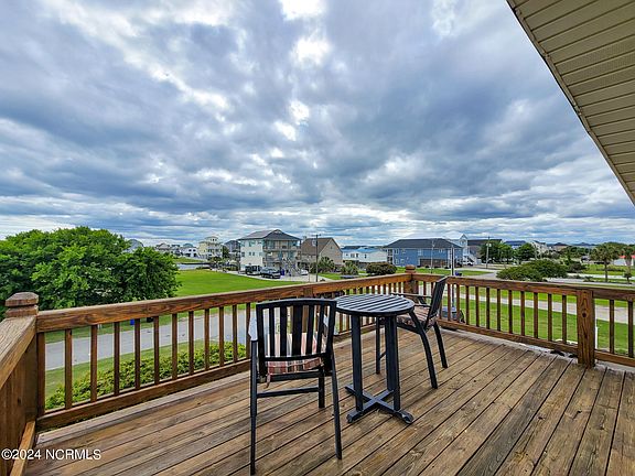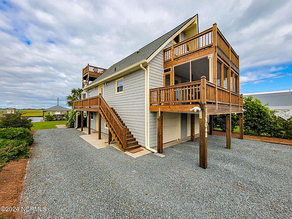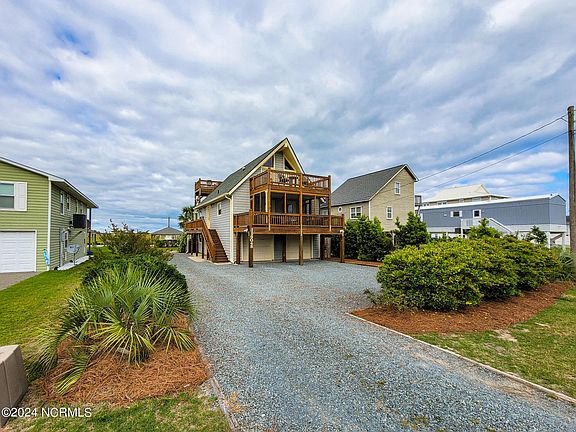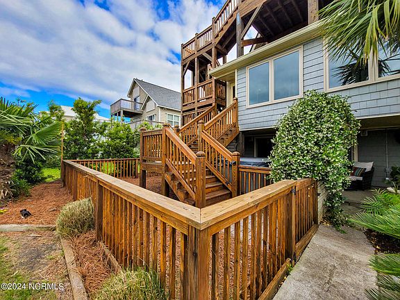 Welcome to 9048 W 9th St, a stunning canal-front retreat in the heart of Surf City, NC. This exquisite property boasts four spacious bedrooms and three full bathrooms, including a luxurious custom ensuite in the main bedroom. The main living area features an expansive open floor plan that flows seamlessly into a bright sunroom, offering breathtaking views of the serene Topsail sound. Step outside to discover extensive deck space, including a rooftop widow's walk that provides panoramic vistas, perfect for watching the sunset or stargazing. This fully updated home is designed for both relaxation and entertainment, with a hidden oasis in the back porch area featuring a hot tub, lounge seating, and an outdoor shower, all surrounded by lush plants and vibrant flowers. The downstairs in-law suite comes complete with its own kitchenette, bathroom and separate entrance, providing privacy and convenience.