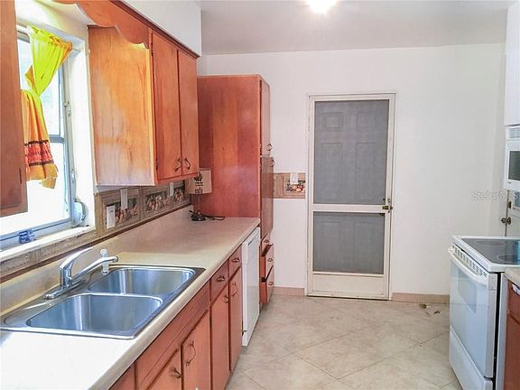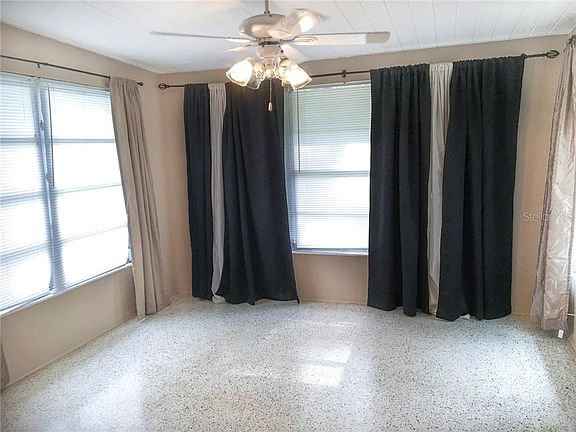 This home features terrazzo floors throughout with a connected large entry, living room and dining room. Galley kitchen has white appliances and access to the one car garage. 2 Bedrooms with window treatments. Hall Bathroom has a tub / shower and space saving over the toilet shelving. Nice size backyard with lots of shade. Lawn Service is included. Washer / Dryer Hookups Only. Located a block from the Bradenton Country Club and near shopping, banks, schools & doctor's offices.