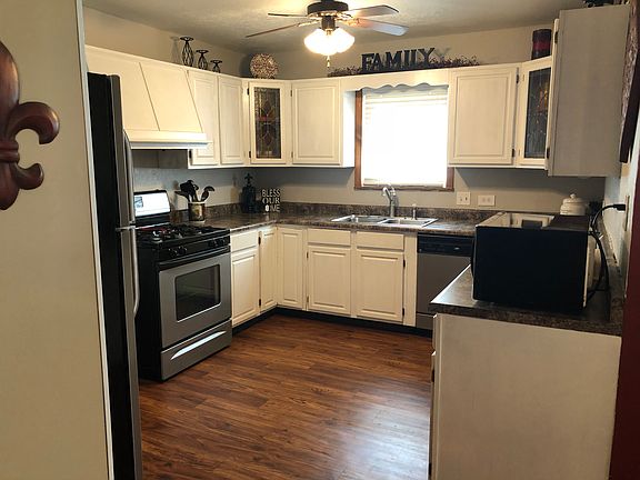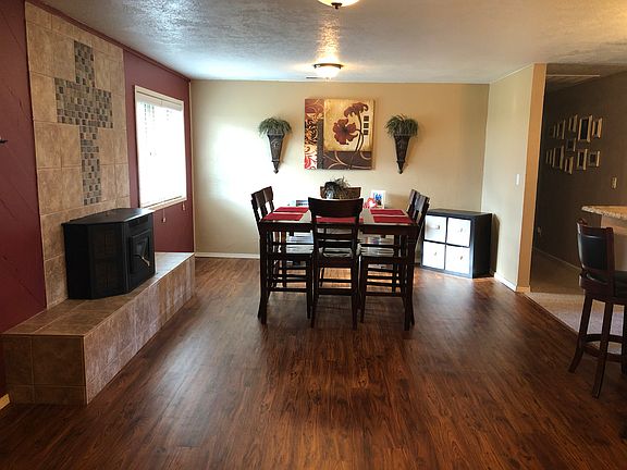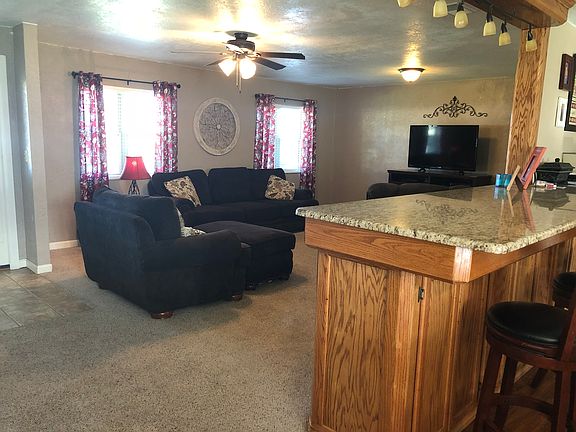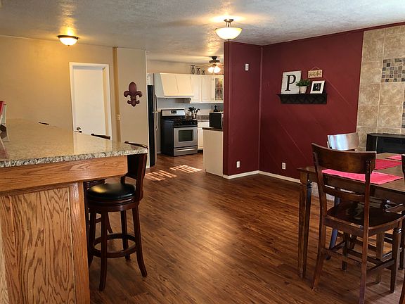 Open concept. New flooring in kitchen, dining area, and basement. New metal fence. New paint in bedrooms and basement. Newer windows and overhangs. HAVC new in 14. Sprinkler/irrigation, 3 storage building. Large bar overlooking living area.