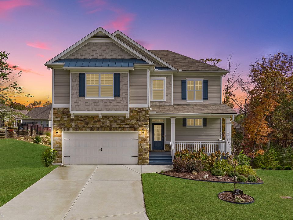 Nestled in the majestic foothills of Lake Arrowhead. This gorgeous, stone accented, almost new craftsman style home is located on a cul de sac and offers master on main and open concept living. Sitting on a large corner lot, this home has loads of curb appeal with spacious front and side yards that offer low maintenance care. The home features a charming rocking chair covered front porch perfect for unwinding and enjoying the quiet neighborhood. This home was built in 2021 with upgrades galore! Head inside to find neutral paint throughout, updated flooring, and modern fixtures. The chef inspired kitchen offers white cabinets, a beautiful center island, subway tile, granite countertops, and stainless steel appliances including double ovens and a built in stove top and microwave. Enjoy an open concept floor plan on the main perfect for everyday convenience or entertaining a crowd, with a dining area and view to adjoining family room from the kitchen. Your master suite is located on the main, complete with a en suite bath featuring a large soaking tub, separate shower, dual vanities, and an oversized closet. Head upstairs to find a bonus area perfect for an office space, playroom, or secondary living area. There are 3 additional bedrooms and a shared full bath on the second level, all offering spacious room sizes and closet space. The shared bathroom upstairs offers a shower/tub combo and dual sinks. The unfinished terrace level offers space for you to customize this home for additional living space best suited for your needs. This level is stubbed for another bath and has a charming wood burning stove with a stone accent wall already in place to make a cozy nook for yourself or guests. Build this space to fit your needs with a media room, office, or in-law suite. The sky is the limit! You will also enjoy beautiful outdoor spaces, including a two tier deck and outdoor fire pit. You can access the trellis topped upper deck from the main level living space and the charming lower level deck from the terrace level. From either space, you will enjoy stunning views! This home is within a spectacular community that is truly one of a kind. Lake Arrowhead amenities include championship golf course, 540 acre lake, marina, clubhouse with restaurant, hiking trails, 2 pools, tennis courts, Pickle Ball and so much more!