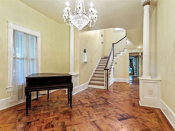 Welcome to this stunning historic residence that artfully blends classic character with exquisite craftsmanship and enduring elegance. As you step into the dramatic foyer, you're welcomed by a sweeping grand staircase flanked by stately architectural columns and illuminated by a striking chandelier, a grand entrance that sets the tone for what lies beyond.