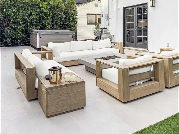 HUGE yard with hot tub, sauna, outdoor shower, fire pit, and lounge seating.