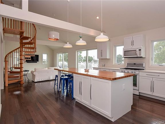 - Interior: Bedroom on 1st Floor, Breakfast Bar, Double Vanity, Open Floor Plan, Recessed Lights, Kitchen Island, Spiral Stairs