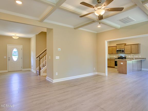 Welcome home to the coveted Chelsea floor plan with over 2100 beautiful square feet of living space located in the beautiful Shadow Creek Estates. Once you step inside the first thing you'll notice is the gorgeous electric fireplace complete with a floating mantle, raised hearth, stone surround and flanked by built-ins. The stunning coffered ceiling will likely be the next feature that catches your eye! The spacious living room opens into the dining area and just outside the dining space is a large 12x12 deck, perfect to enjoy those Carolina mornings or evenings. In the kitchen you will find granite countertops which compliment the shaker style cabinets. Worried about kitchen storage? No need to be with the large, corner, pantry closet. The primary en suite includes ceramic tile floors, dual vanity, shower, separate water closet, and linen closet. No need to worry about closet space and storage as the secondary bedrooms have spacious walk in closets. This is the one to make your memories in!