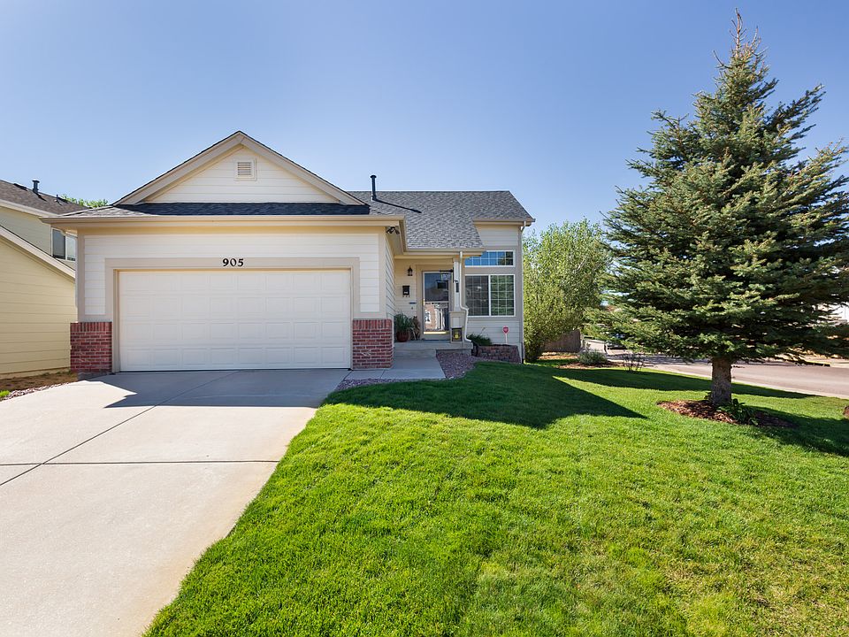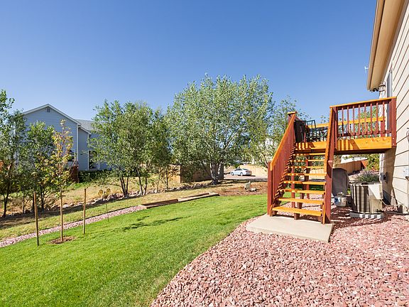 This gem loaded with charm! Not only is this home one of the cutest homes in Fountain but it's immaculate & extremely well cared for. With outstanding curb appeal, it sits on a large corner lot w/perfectly maintained lush green landscaping in an established family neighborhood. AND this beauty backs to tree-lined open space w/a dry creek bed so the scenery is private and lovely, not backing to another house. This home will warmly greet you w/an open floor plan & your choice of two master bedrooms, one on the main level or the other in the basement w/garden window & adjoining lavish bath. The 3rd BR on the main level has wood flooring. The appealing main level has vaulted ceilings, warm lighting & lots of real 3/4" oak hardwood flooring. The basement w/garden level windows feature a rustic & warm fireplace w/sconce lighting is a wonderful place for fun and/or relaxation. Don't miss ALL NEW upgraded roof, garage door, gutters, Bosch dishwasher + upgraded bamboo blinds & water softener.