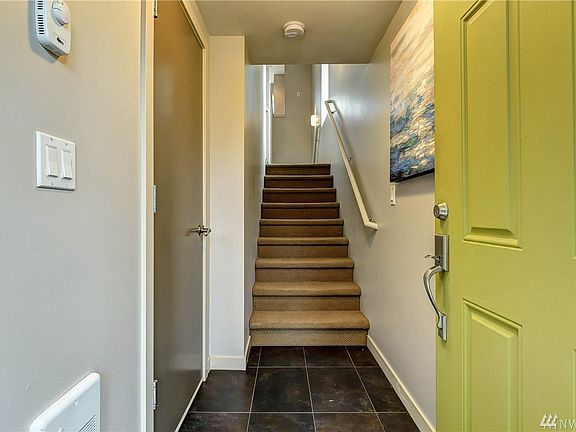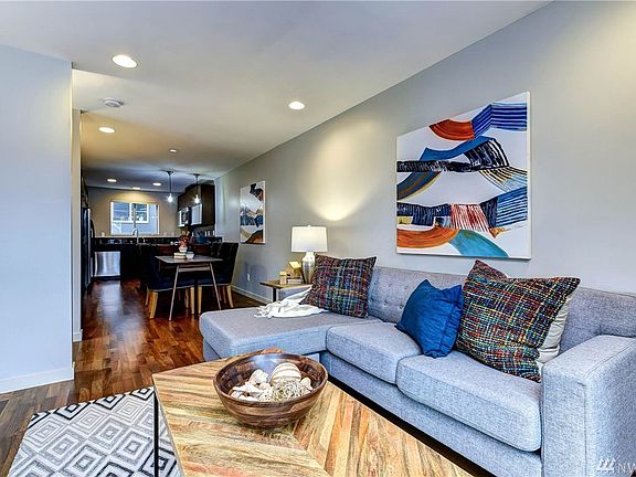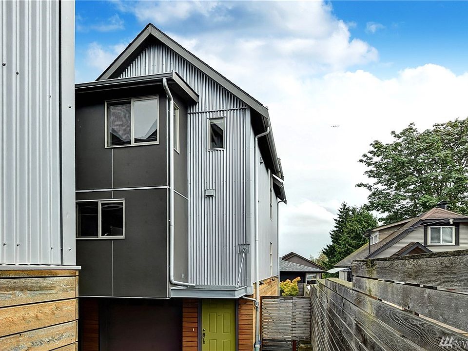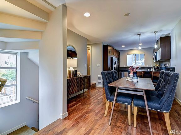 Prime location! Walk to everything & delight in convenient commuting options (bus/99/I5). This stylish end unit townhouse invites abundant natural light & is setback for maximum privacy. Open layout w/ walnut hardwoods, living w/ fireplace, dining & modern kitchen w/ breakfast bar. Vaulted ceilings keep it airy in the upstairs 2 beds & bath. The lower level bed/office opens to a patio oasis, w/ garden space. No dues, attached garage, xtra storage, fully fenced & freshly painted. This is the one!