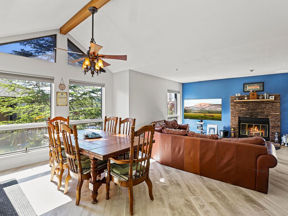 Newer appliances , Updated Kitchen cabinets boast black appliance, built in microwave, inset sink and quartz countertops., Solid core doors and updated flooring throughout . Vaulted ceiling in dining area with picture windows to enjoy pines open to living room with stone surround wood Fireplace. Master with remodeled bath, private exit to patio and walk in closet.