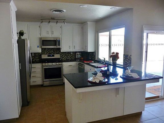 This home has 4 bdrms, 1 ¾ baths all in 1872 sq ft. As you enter you will notice the new landscaping, brick patio & the new leaded glass door...which leads to the tiled entry & the living area. There is a bedroom/office off the living area. The large living room looks into a family/dining room with fireplace. The kitchen has new granite counters, stainless gas range, microwave, dishwasher & refrigerator. The tile flooring is thru out the house except bedrooms have carpet. The baths have been re-done with new low flow, dual flush toilets, new guest tub & enclosure & new master shower, new vanity & linen closet in master bath, new faucets, mirrors, new granite counters & new flooring. There are 5 ceiling fans, scraped ceilings, inside laundry with new pantry, fresh paint inside and out, closet organizers, 2 new master closets, new lighting inside & out. The back yard is surrounded by a block wall & has a shed. There is A/C, newer roof & RV parking with slab. This is a MUST SEE