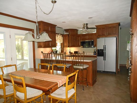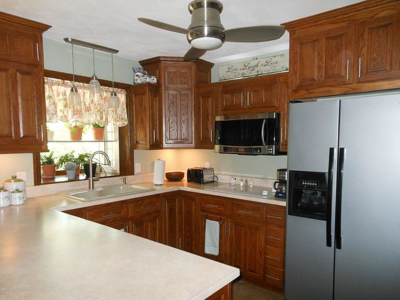 Situated on a double lot with tree lined, private backyard this 4 sides brick home exhibits lots of TLC! Wonderful curb appeal and courtyard draws you into the home.Formal dining area and living room lead to the spacious family room with focal fireplace, bar area and open to kitchen that has been COMPLETELY UPDATED! Abundance of cabinetry, pantry, stainless appliances, double oven, window over sink, breakfast bar, dining area and walk out to sunporch that adjoins spacious deck. Huge master suite boasts 2 walk in closets. All bedrooms are spacious. Lower level displays huge family room, wood stove, 3rd bedroom, full bath, oversized laundry room/kitchenette, office space (could be 4th bedroom), safe room. John Deere garage down is awesome workshop space! Could be second living quarters down