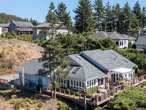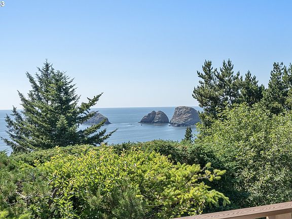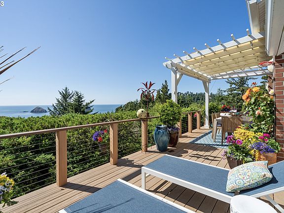 WORLD CLASS OCEAN VIEW includes Three Arch Rocks off charming Oceanside hamlet. Rare combination to find a view of this caliber in a one-level upscale home in a private setting. Major recent remodel turned this home into a showplace of contemporary appeal; maximizing views, open space, and natural light. Near end of private road, high above the wave action, miles of ocean view. Huge view deck with pergola. Trex for easy maintenance and durable life. Inviting courtyard with hot tub, feels like vacation every day! Roof/gutters new in 2020. Generac whole house generator. Hot tub is negotiable.
