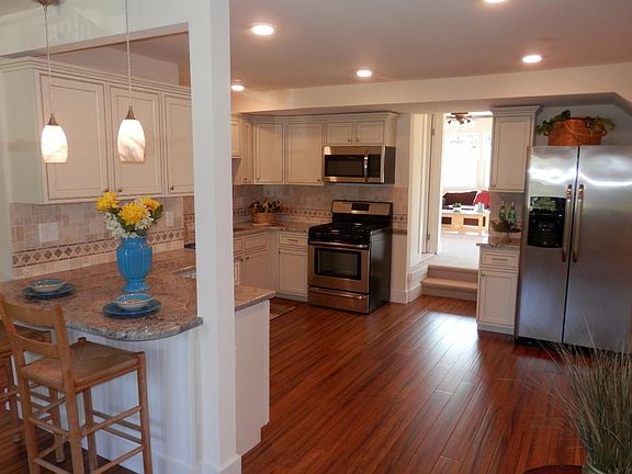 LARGER THAN IT LOOKS!!! Beautifully redone expanded 4 bedroom Cape Cod on large corner lot. Open, airy and bright living room, kitchen & dining room has that modern GREAT room feel. Hardwood floors thru-out all 3 rooms. Kitchen has been completely remodeled to include: raised panel cream glazed cabnetry, soft close drawers, granite countertops, decorative tile backsplash, recessed lighting, pendant lighting over peninsula island, brand new stainless steel appliance package. HUGE dining room/another family room/game room/office has 2 ceiling fans, loads of recessed lights and seperate side entrance. 20x15 family room off to the back off the house has recessed lighting, new carpeting, new sliders that lead out to new deck. All 4 bedrooms are generously sized with new carpeting. Ceiling fans in most rooms. Brand new master bath with decorative ceramic tile floors, ceramic tile tub surround, new fixtures. Brand new WINDOWS. Updated heater and central air. Large shed in backyard has been re-sided, has a new roof + electricity. Main floor laundry room. Large driveway. New concrete patio area out front. Don't hesitate - THESE HOMES DON'T LAST!