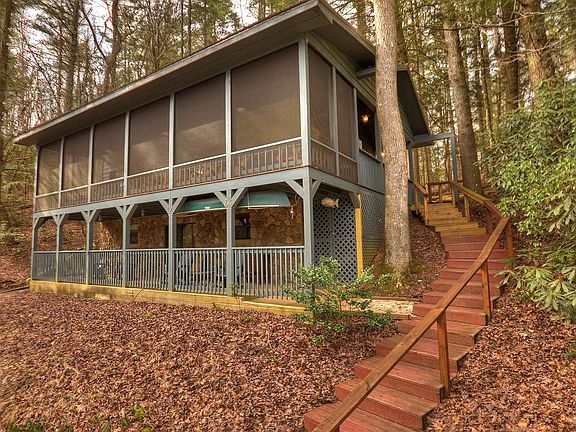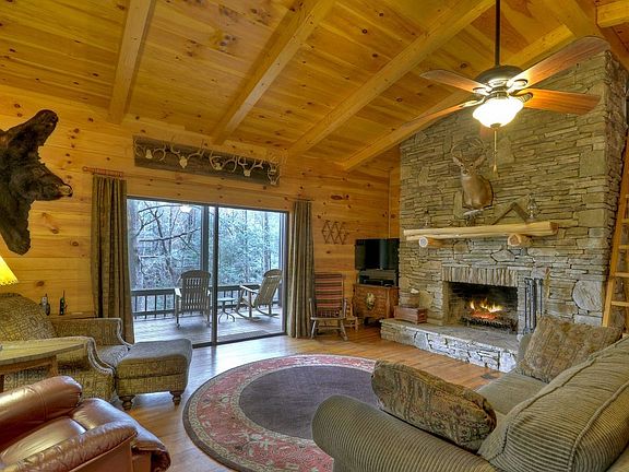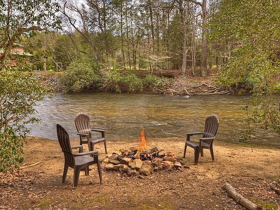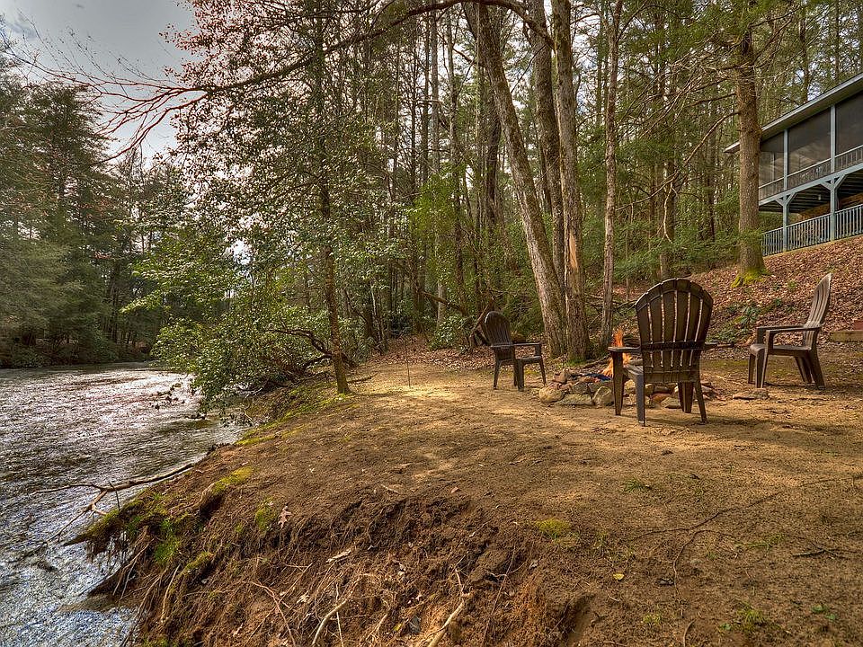 409 FEET OF LEVEL TOCCOA RIVER FRONTAGE & BORDERS USFS near entrance to Blue Ridge WMA! No neighbors on 3 sides & closest cabins are across the wide river! Beautiful 1.52 acres of hemlocks, mountain laurel, rhododendron! Very open main floor leads to HUGE screened porch facing the river! Lower level also leads to HUGE open porch facing the river! One of a kind custom artisan built kitchen cabinets, real hardwood floors thru out main level, real masonry fireplace, windows everywhere to take in the beauty! BEST LOCATION amidst all the fishing hotspots, trails, waterfalls!