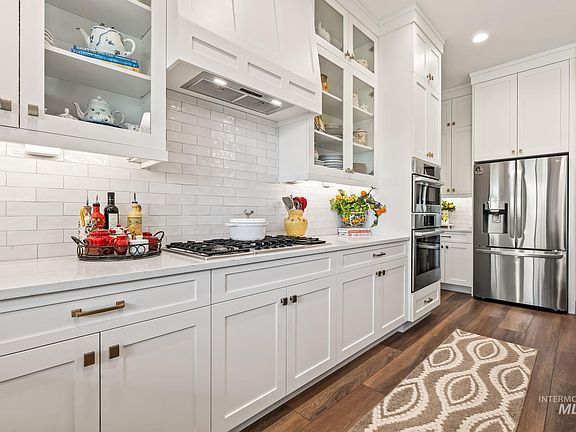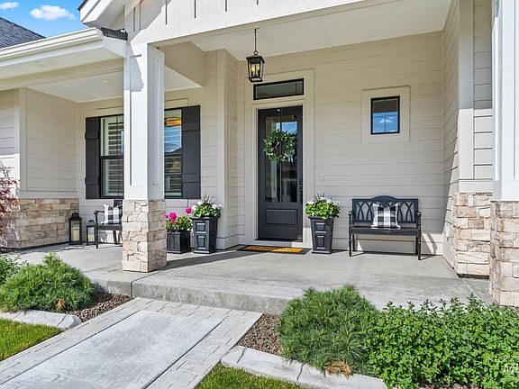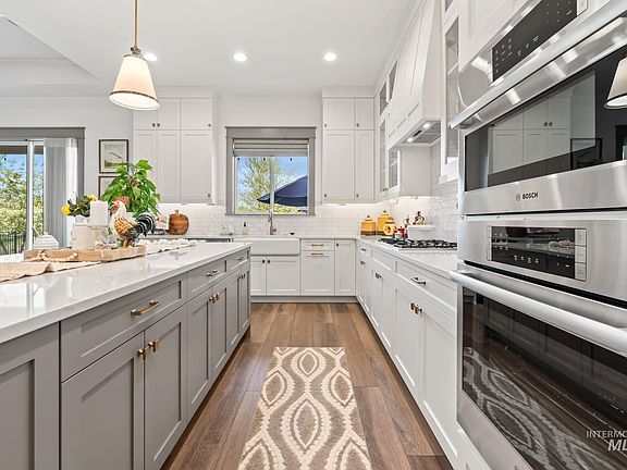 Custom single-level 4 bedroom, 2.5 bath home. New designer features, gourmet kitchen, five gas burner Bosch stove, matching appliances. Soft close cabinets & drawers, farm sink, hidden outlets, coordinated lighting. Quartz countertops & 10' island kept tidy with 5'x12' Butler's Pantry wired for coffee, toaster, etc. Great room dining area, 10-foot ceilings, exposed beams in family room, gas fireplace & electric drapes opening to patio waterway view. Beautiful primary retreat: walk-in closet, quartz counters, dual sinks & huge spa shower. All weather pet-friendly designer flooring, laundry room with sink & custom mudroom. Energy-efficient home, warranties, dual pane windows, HVAC, solid core doors, ceiling speakers for Sonos, recessed lighting, ceiling fans, Hunter Douglas window coverings, 4" shutters. Waterway backyard, covered patio, lights & speakers. Finished 4 car garage, bonus storage. Exceptional location near the pool, fishing pier, quick walking access to Boise River greenbelt, shops, dining.