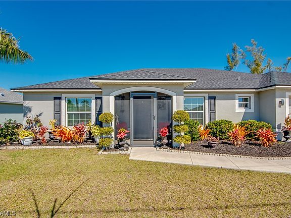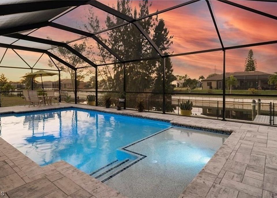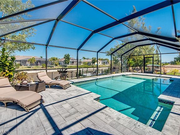 Perfectly suited as a profitable vacation rental, full-time residence, or a 2nd home retreat, this property is very attractively priced and truly has it all. This Gorgeous, No-Flood-Zone Pool Home in SW Cape has over 2000 square feet and boasts 3 Beds/2 Baths with a Den/Flex Space that's perfect as a home office, a formal living room or can be converted into a 4th bedroom. It also has a Pelican whole home water filtration system and under sink R/O that both convey. With its gourmet kitchen and open concept living space, this meticulously maintained property is an entertainer's delight. The newly built, expansive saltwater pool measures 28x14 and has electric heating, a sun shelf entry with bubblers, arching fountain spouts and ample bench seating and outdoor shower. Outside is also outfitted with a new composite boat dock, an oversized super-screen caged lanai, mature landscaping and a variety of tropical fruit trees including avocado, banana and pineapple. There's an organic vegetable/herb garden, a fenced-in back yard and lovely canal views as well. The master bath was updated in 2023 with an extra-large, tiled shower, a bonus linen closet and an over-sized walk-in with custom built-ins.