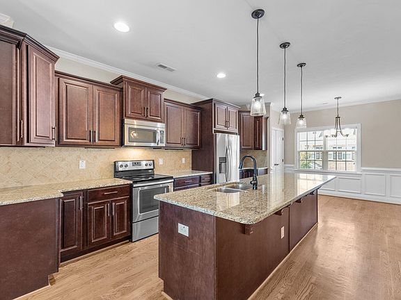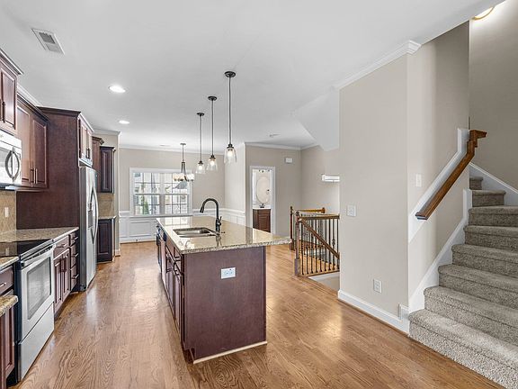 Welcome to Apex, "The peak of good living"! This luxurious three-level townhouse boasts a spacious master suite, three additional bedrooms, 3.5 baths, a modern kitchen, and a cozy family room with a gas log fireplace. Enjoy durable fiber cement construction, and a blend of carpet, hardwood, ceramic, and laminate flooring. Outdoors, indulge in a waterfront view from the covered porch or deck. Amenities include access to a private community pool, clubhouse, and landscaped lot. Located within the Apex city limits, it's served by top Wake schools. HOA covers essential maintenance, with city utilities connected. Experience modern comfort and convenience at its best!