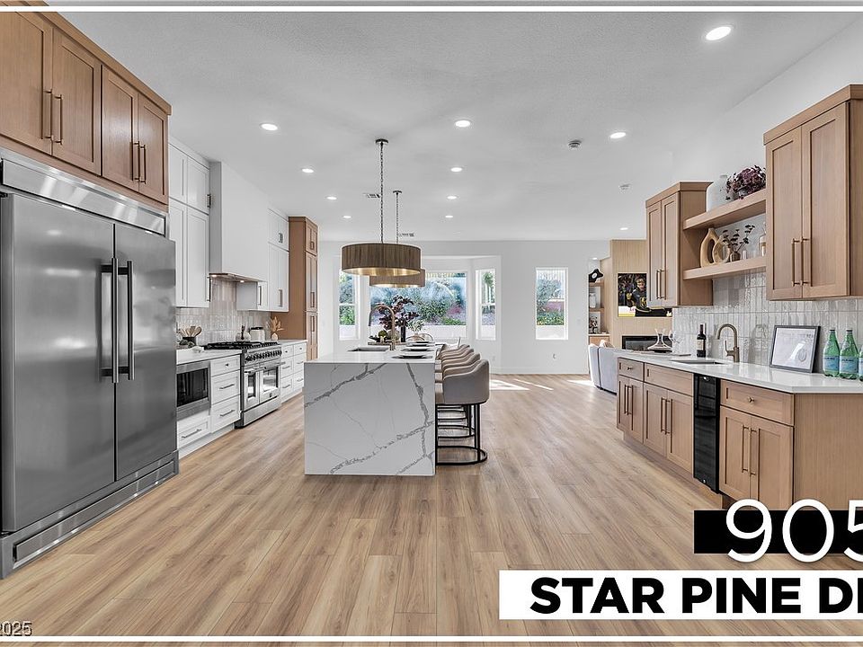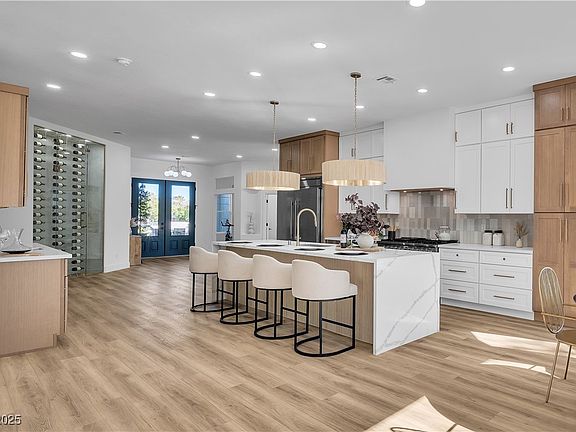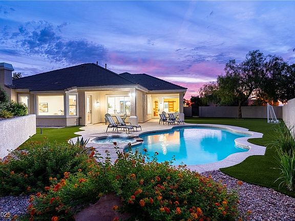 Want NEWLY CURATED LUXURY in premier Summerlin? Discover this fully reimagined single-story residence, sitting PEACEFULLY IN A GATED enclave, moments from DOWNTOWN SUMMERLIN, Red Rock Canyon, top dining, and freeway access. Featuring a THREE-CAR GARAGE and an oversized lot with a sparkling POOL, expansive side yard, and NO REAR NEIGHBORS, the home delivers desert elegance with effortless PRIVACY. A refined entry sets the tone for sunlit interiors finished with DESIGNER-LEVEL materials and modern fixtures. The GOURMET kitchen showcases oversized appliances, DOUBLE-STACKED, TWO-TONE cabinetry, a waterfall-edge 12-FOOT ISLAND, a CUSTOM glass-enclosed 60-BOTTLE wine room, and a statement WET BAR with brass detailing. The primary suite is a calm retreat with POOL views and patio access, complemented by a spa-inspired TUB set within an oversized glass-enclosed shower. 4 beds. 4 baths. Resort-style living that inludes the family. A true SUMMERLIN GEM that must be experienced in person.