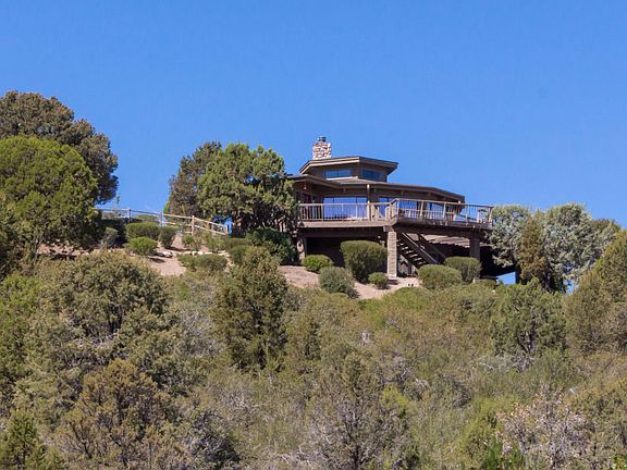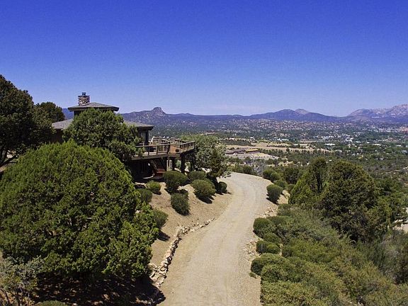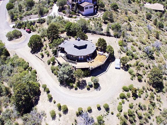 LOCATION, LOCATION, LOCATION! This stunning and unique eco-friendly dodecagon ( 12-sided) This home sits perfectly atop of the hillside in Prescott, Arizona in the prestigious Prescott Foothill Estates offering fabulous panoramic views of Thumb Butte, Granite mountain ,the city and much more! This home boast many upgraded and custom features; travertine sink, wood floors, vaulted beamed ceilings, lots of natural lighting Andersen windows, split floor plan with a walkout basement . Great patio and a wrap-around deck to enjoy the views. custom stone fireplace with built in conversation seating. Bonus-room could serve as 3rd BR as it has a closet. wood-siding, New roof Feb 2016, newer cooktop, and dishwasher!
