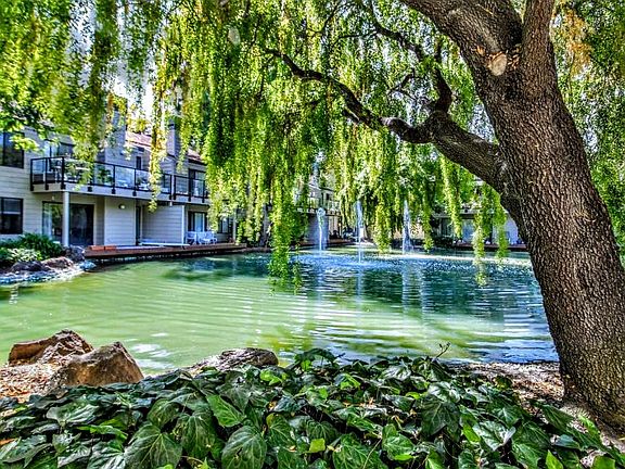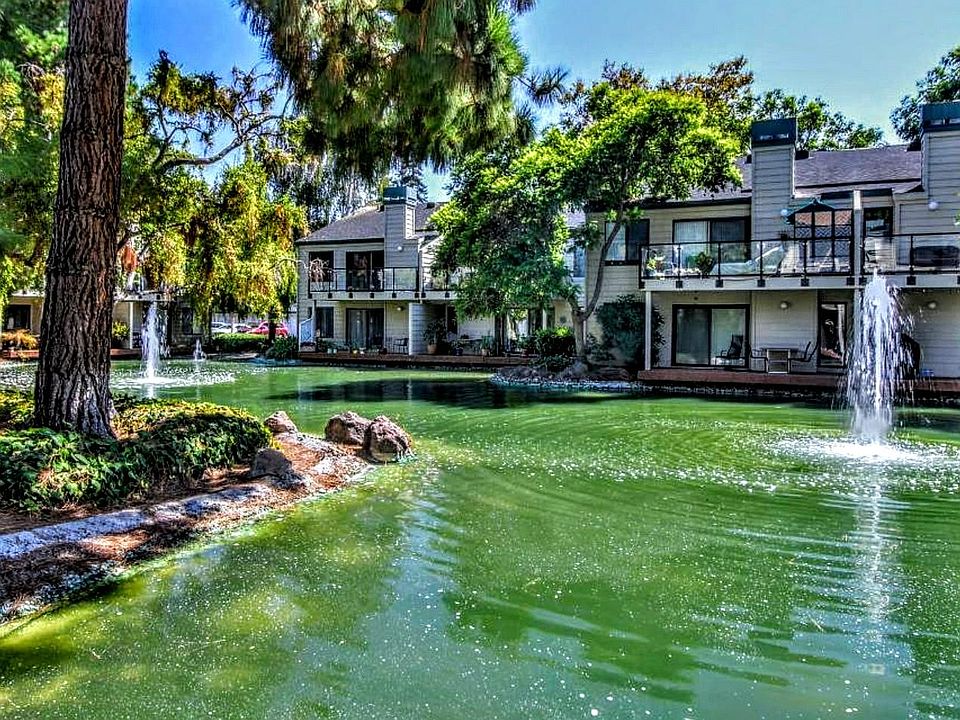 Elegant newly remodeled Waters Condominium. Gorgeous waterfront setting Upstairs with vaulted ceilings and large balcony over the private pond. Pool and jacuzzi Soaking tub and double shower in the home All new top of the line Kitchenaid Commercial appliances in black stainless steel (doesn't show fingerprints) Tennis courts Victory garden plots for growing veggies Private garage with ample storage This unit is minutes walk from the miles of trails of the open space preserve Easy walk or Google bike to Google campus Pets are welcome Washer and dryer in unit Two bedroom, two full bath. Ideal for roommates or a family. You can walk to downtown Mountain View and the Castro train station and restaurant and entertainment district along Castro St. There is the Mountain View Center for Performing Arts and the many cultural and theatrical events plus wonderful restaurants and bookshops and coffee houses with poetry and open mike nights and music spilling into the street from cafes. This is a real destination walk-around village. Directions: Enter from Shoreline Blvd driveway and veer right down to the end. It's the building straight ahead upstairs. Owner pays water and garbage