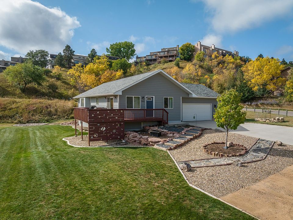 Listed by Jeremy Kahler, KWBH, 605-381-7500. *Seller to offer a buyer's agent bonus of $4,700 if property is under contract by January 24th** Nestled on a quiet street just below Skyline Dr, this one-owner home offers convenient single level living with the bonus of a fully finished walkout basement! *5 bedrooms, 3 bathrooms and 2,626sqft *Open concept living area with dining and kitchen areas that open to the living room making entertaining a breeze *Corner kitchen with shaker style cabinetry with soft close drawers, a stainless steel Frigidaire appliance suite and a kitchen island for added seating and storage *8' ceilings throughout the main level, accented by wood floors and great natural light *Private main level primary suite with a spacious bedroom with ensuite bathroom and walk in closet *2 additional bedrooms, 1 full bathroom and main level laundry complete this level *Walkout basement level has a large 'L' shaped family room with ground level windows and a wet bar for convenience *2 additional bedrooms, 1 full bathroom, a bonus room with storage closet and a mechanial room with 2nd laundry hookups complete this level *Outside has an attached 2-car garage that is partially finished, has built in overhead storage and a pedestrian door to the back yard *Wrap around deck in the front yard, overlooking the professionaly curated front landscaping space, complete with seating areas with rock accents, a river rock walkway and curb a yard detailing.