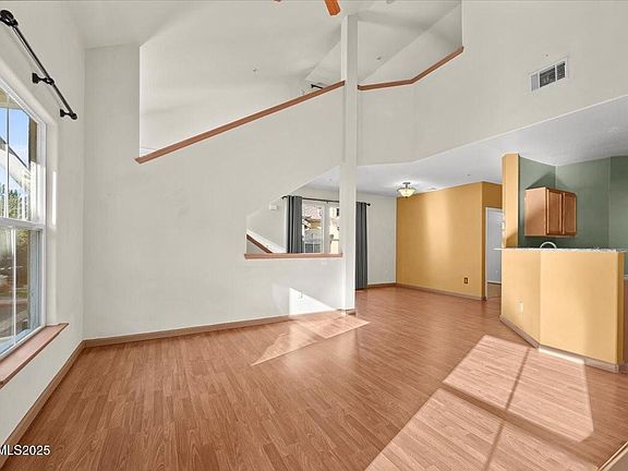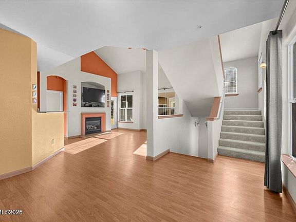 Located in the peaceful gated community of Triana, this light-filled residence enjoys bright southern exposure and beautiful views of Mount Rose. The flexible floor plan offers two bedrooms plus a loft, soaring ceilings, and a wide-open living area anchored by a central hearth and adjacent private balcony. Abundant natural light enhances the spacious feel throughout. Two separate single-stall garages connect at the main level and include additional storage. Ideally positioned just steps from the community pool, spa, and BBQ areas, with Huffaker Hills open space nearby and quick access to shopping, dining, and city conveniences just minutes away.