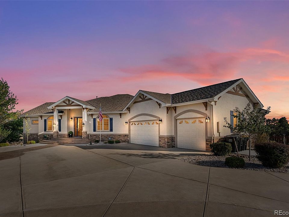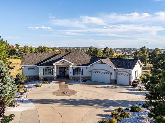 Opportunities like this are rare in Bell Cross Ranch. With only a handful of custom estates in this enclave, homes seldom come to market and this one, set on over 3 acres & bordered by 160 acres of open space, is unforgettable. From the moment you step inside, light pours through expansive windows framing panoramic views to Pikes Peak. Over 6,100 sq ft unfolds with soaring ceilings, seamless flow, and four bedrooms, each with its own en suite bath. More than $300,000 in upgrades adorn this home — a new roof in 2024, fresh paint inside & out, refinished Alderwood hardwoods, stacked-stone fireplaces, new carpeting, & updated main-level lighting. At the heart of the home, the kitchen is designed for gathering. An oversized granite island, Alder cabinetry with pull-outs, stainless appliances, & a new 5-burner gas cooktop make it as functional as it is beautiful. Just beyond, the living room invites you to linger by the fire while gazing out at wildlife & open space. The main-level primary suite feels like a retreat, with its own fireplace, bay-window sitting area, spa bath with jetted tub, oversized shower, & dual walk-in closets, one cedar. Downstairs, the walk-out level expands the possibilities: a full bar & gathering room, private guest suites, a secondary office, or if you prefer a custom theater.