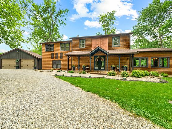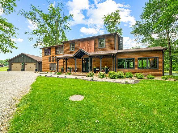 Stunning country home with a picturesque setting now offered for sale just minutes from downtown Columbus. Situated on over 5 acres, with a beautiful 1 acre stocked pond and 40x80 outbuilding with electricity, this is the rural paradise you have been searching for! Recently renovated with a new kitchen and butler's pantry, main floor bonus room, new flooring on the main level, and brand new attached two car garage; plus a new front entryway, new front and rear doors, custom window treatments and much more! The main level features the beautiful custom kitchen with soaring ceilings, dining room with abundant natural light, great room with vaulted ceiling and gas log fireplace that walks out to the covered rear porch with views of the pond and woods, the main level is finished out with the brand new bonus room that connects to the attached garage. Upstairs you will find the primary retreat with walk-in closet and sitting room, second full bath, loft and second bedroom. In addition to the 3200 sqft pole barn, there are two smaller out buildings, perfect for storage, or keeping animals. A garden plot is already established, as is the berry patch, full of fresh strawberries and blackberries. Don't miss your chance to own this amazing homestead. Schedule your showing today!