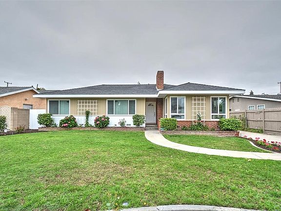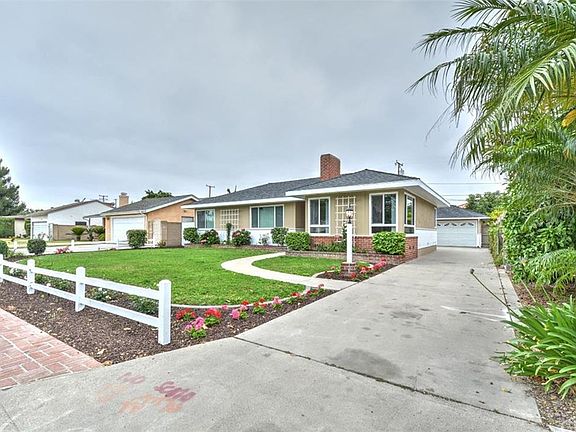 Charming Garden Grove home, complete with a white fence around the property, on a beautiful tree lined street. The home has wood flooring throughout with ceramic tile in the kitchen and both bathrooms. The entire home has had a complete remodel from top to bottom; including central air and heat, electricity, plumbing and roof. Home has two fireplaces, one in the living room and one in the great room. All rooms have recessed lighting with ceiling fans in the three bedrooms, dining area and great room. The kitchen is amazing and will definitely be the place to be! It's huge, open floor plan, granite counter tops, flows into the great room both having direct view to the back yard. Both bathrooms have been completely remodeled, granite counter tops with porcelain tiles on the floors and in both showers. The backyard has an adorable play house, painted to match the main home, the kids will have hours of fun and parents can watch from the backyard, the great room or kitchen. The backyard has a covered patio perfect for entertaining, several fruit trees, along with an active avocado tree. The detached 2 car garage sits at the end of a very long driveway, also with a new roof. This home has it all, completely remodeled and gorgeous!