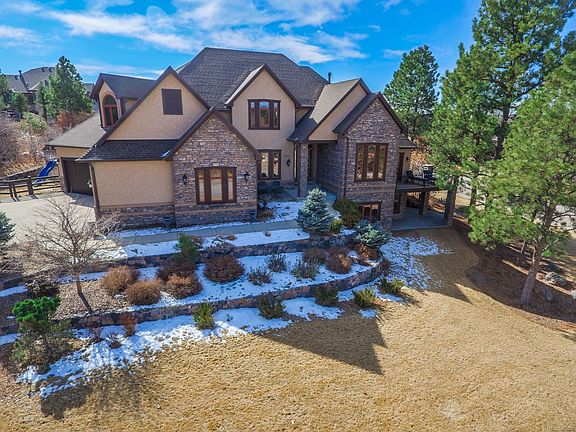 Welcome home to this elegant two story main floor master custom in the coveted Timbers at the Pinery! This home offers a rare mix of luxury, style, and comfort situated on a corner lot with a four car garage! The main level features hardwoods throughout with a formal living, formal dining, large gourmet kitchen overlooking the family room, private study with deck access, and a partially covered patio in the backyard. Don't miss the main floor master suite with a cozy fireplace, sitting room, and access to a wrap around deck. Choose from one of two staircases with main being a spiral staircase leading to three bedrooms on the upper level complete with one ensuite and one jack and jill bath. The unfinished walkout basement is perfect for any additional space for your customization. Outdoors you can enjoy the private backyard or the large front yard with large Ponderosa trees reminiscent of the mountains. Must see home in the Timbers at the Pinery!