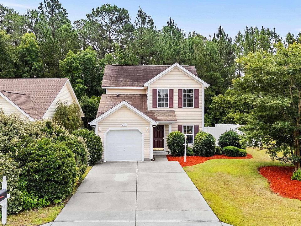 Welcome to this charming two-story home, featuring three spacious bedrooms and two and a half bathrooms. Nestled in a serene neighborhood, this property boasts an inviting open floor plan with cathedral ceilings and ample natural light throughout. The home was just repainted so it is move-in ready for you. The first floor showcases a cozy living room, kitchen, and dining area perfect for family gatherings and entertaining. The first floor primary bedroom is tranquil and complete with an en-suite bathroom. Upstairs you will find two guest bedrooms and a shared full bathroom. In one of the bedroom closets you will find added storage attic space that could be finished for additional uses. Enjoy outdoor living in the private backyard, ideal for both relaxation and entertaining. The privacy of the backyard with its beautiful nature and trees offers a peaceful and private setting. This community has a pool to enjoy for those warm days and a playground for families. Southgate is located in the Carolina Forest area and conveniently located close to schools, colleges, hospital, shopping, parks, dining and of course the beach! Don't hesitate to book your showing TODAY!